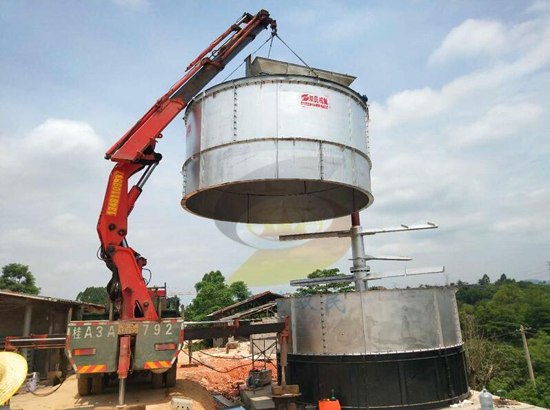 發(fā)酵罐主要由發(fā)酵室、液壓動力系統(tǒng)、主軸傳動系統(tǒng)、上料提升系統(tǒng)、自動高壓松風(fēng)系統(tǒng)、出料系統(tǒng)、除理臭味系統(tǒng)和自動控制系統(tǒng)組成,工作時,先由上料提升系統(tǒng)將物料送到發(fā)酵室,開啟液壓動力系統(tǒng),主軸開始轉(zhuǎn)動,實現(xiàn)物料攪拌,同時,開啟送風(fēng)系統(tǒng)和輔助加熱系統(tǒng),維持微生物發(fā)酵條件。等物料在微生物菌劑的作用下腐熟、降解穩(wěn)定后,通過液壓動力系統(tǒng)開啟落料閥門,利用皮帶輸送機(jī)將發(fā)酵后的物料,發(fā)酵后排出的氣體通過系統(tǒng)收集處理達(dá)標(biāo)后排除。