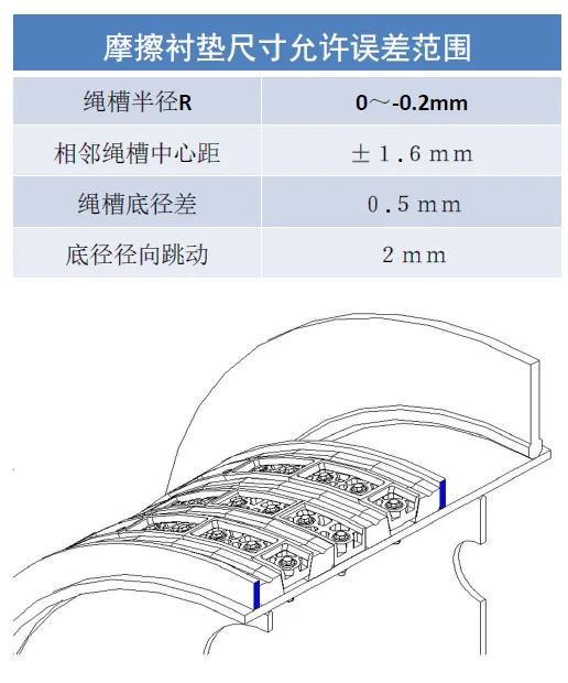 當(dāng)磨損達到一個鋼絲繩直徑的深度,或沿側(cè)面磨損達鋼絲繩直徑一半時,或襯墊磨損后剩余厚度為鋼絲繩直徑的一半時,三種情況中有一種就應(yīng)更換襯墊。