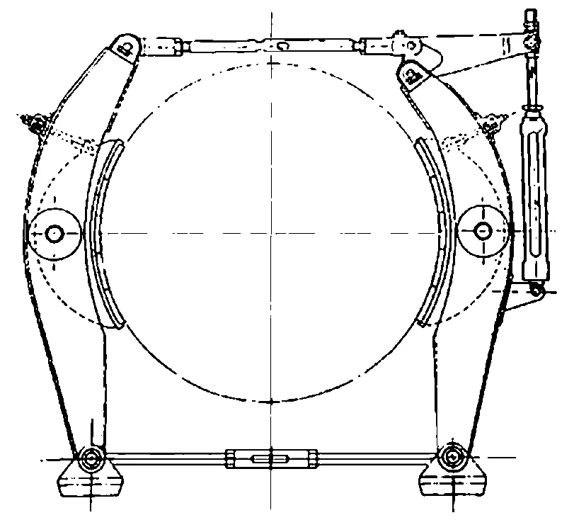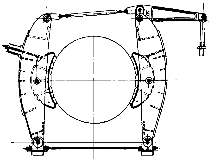 (3)綜合閘 早期國產(chǎn)的 JKA 型提升機(jī),舊角移式閘瓦存在磨損不均問題,其制動系統(tǒng)的改造采用綜合閘(見圖 1),以減少閘瓦磨損,延長閘瓦使用壽命。