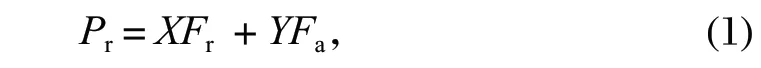 式中:Pr 為聯(lián)合載荷下軸承徑向當(dāng)量動(dòng)載荷,N;Fr為軸承徑向動(dòng)載荷,N;Fa 為軸承軸向動(dòng)載荷,N。