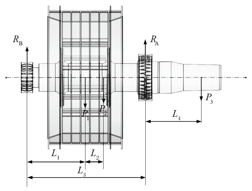 圖2 中,P1 為鋼絲繩動(dòng)張力;P2 為主軸重力 +摩擦輪重力;P3 為電動(dòng)機(jī)重力+磁拉力;L1 為非電動(dòng)機(jī)端軸承中 心線到提升機(jī)摩擦輪中 心線的距離,L1=1 870 mm;L2 為提升機(jī)摩擦輪中 心線到重 心的距離;L3 為非電動(dòng)機(jī)端軸承中 心線到電動(dòng)機(jī)端軸承中 心線的距離,L3=3 800 mm;L4 為電動(dòng)機(jī)端軸承中 心線到電動(dòng)機(jī)中 心線的距離,L4=1 850 mm;RA 為非電動(dòng)機(jī)端 (非傳動(dòng)側(cè)) 軸承承受的支反力,數(shù)值與軸承所受徑向力相同,方向相反;RB 為電動(dòng)機(jī)端 (傳動(dòng)側(cè)) 軸承承受的支反力,數(shù)值與軸承所受徑向力相同,方向相反。