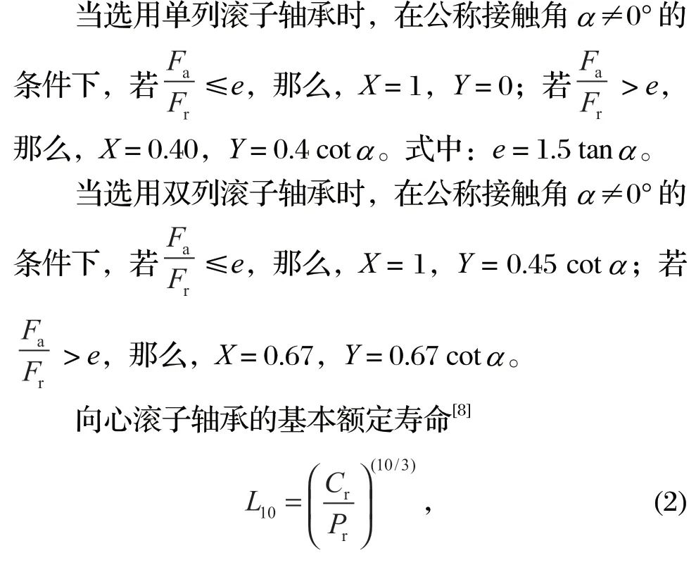 2.2 軸承壽命計(jì)算 當(dāng)公稱(chēng)接觸角 α≠0°時(shí),向心滾子軸承在恒定的徑向和軸向載荷作用下,其徑向當(dāng)量動(dòng)載荷