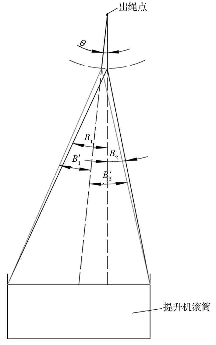 調整天輪和鋼絲繩內外偏角的原則,需保證內外偏角值滿足《金屬非金屬礦山安全規程》規定,同時還要確保出繩點位置不改變,即出繩點應維持在罐籠中 心位置的正上方,保證提升容器穩定,如圖 2 所示。θ 為 1 號天輪和基座整體旋轉的角度,以出繩點為原點順時針轉動;B1 和 B2 為調整之前的內外偏角,圖片′為調整之后的內外偏角,2 號天輪和 1號天輪的調整方式一致,僅旋轉方向為逆時針方向。