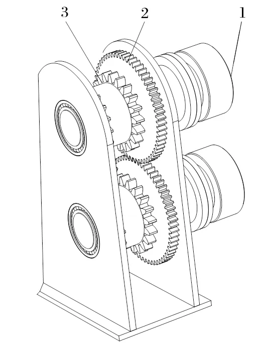 針對(duì)雙液壓馬達(dá)在工作過(guò)程中出現(xiàn)速度不同步問題,在連接鏈輪的軸上加裝一對(duì)同步齒輪,使兩個(gè)鏈輪速度強(qiáng)制同步。送繩機(jī)構(gòu)的局部結(jié)構(gòu)如圖2所示。