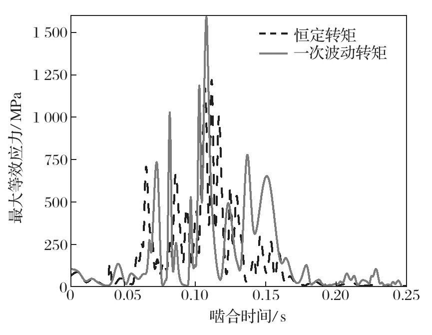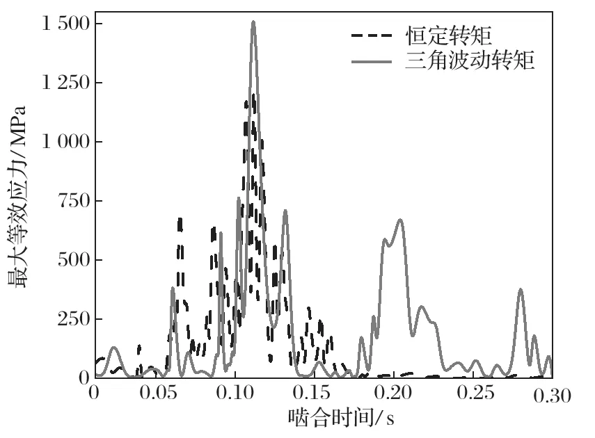如圖12所示,一次波動轉(zhuǎn)矩的zui大等效應(yīng)力變化趨勢基本與恒定轉(zhuǎn)矩的zui大等效應(yīng)力變化趨勢一致,同樣是先增 大后減??;但是zui大等效應(yīng)力幅值變大,甚至超過了材料的屈服ji限。同時,由于一次波動轉(zhuǎn)矩的輸出,即使位于雙嚙合區(qū)時,其應(yīng)力波動相較于恒定轉(zhuǎn)矩輸出時的應(yīng)力波動也是更大。