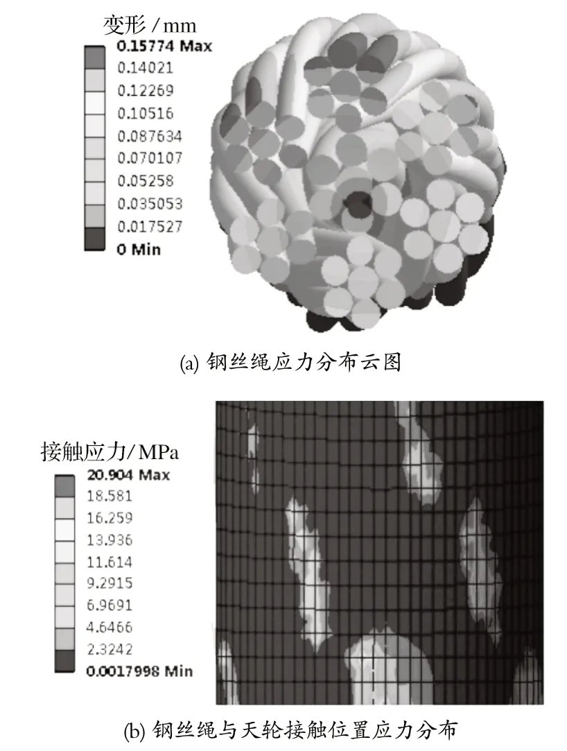 通過仿真結果可以看出,鋼絲繩的應力集中在繩芯處,在 Pro/Engineer 中添加求解項,計算鋼絲繩股內的變形以及鋼絲繩和天輪接觸部位的應力,可以得到如圖7 所示的計算結果。