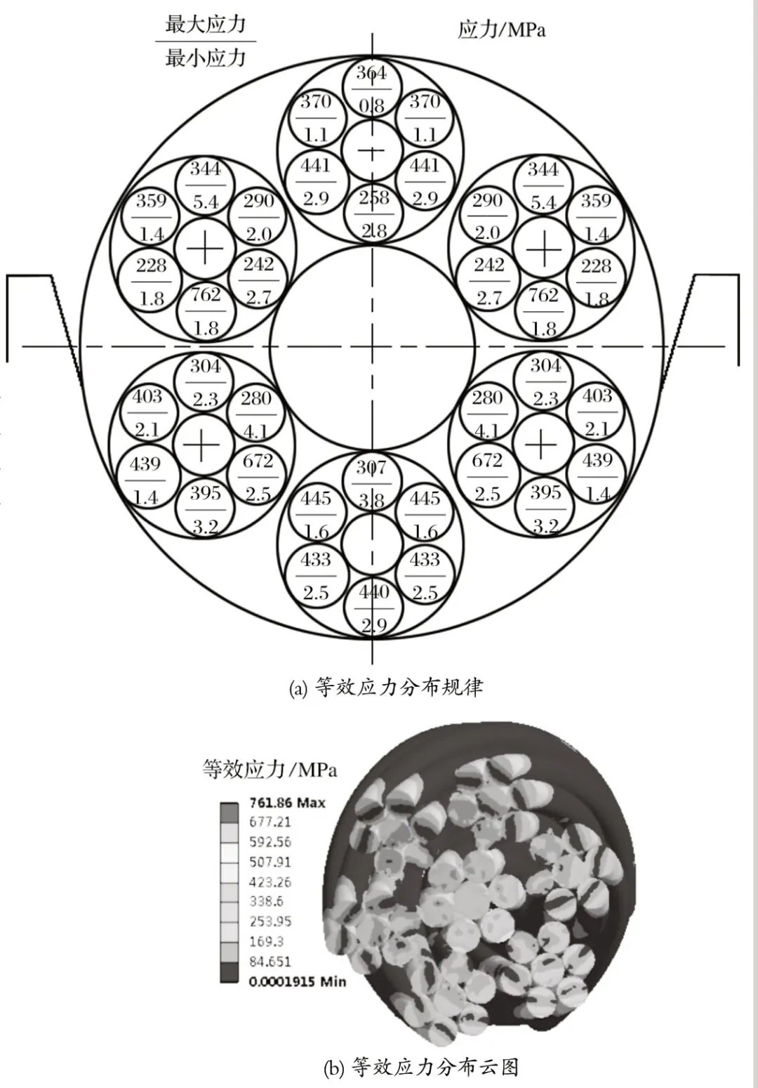 從圖6(a) 可以看出,鋼絲繩在受載作用時,此時的等效應力呈現(xiàn)出不均勻的分布形式,且存在層狀分布;鋼絲繩的應力受到空間位置和相位變化的影響,在繩槽的中 心軸線上下部分分布不均勻;從圖6(b) 可以看到,鋼絲繩截面上應力近似呈現(xiàn)對稱層狀分布,彈性區(qū)域和塑性區(qū)域相互交叉。鋼絲繩的外股層和接觸位置的應力比其他同股的應力較大,此時zui大值為 761.97 MPa,zui大應力分布在靠近中 心軸軸線上半部分的左右兩側。鋼絲繩的交互捻外層股二次捻制鋼絲繩中,靠近繩芯的位置應力比較大,zui大應力是1 121.78 MPa,分布在繩槽中 心軸線上半部分。通過對比圖4 可以看出,zui大應力主要集中在鋼絲繩的外側,不同繩股層的鋼絲繩應力值不同。