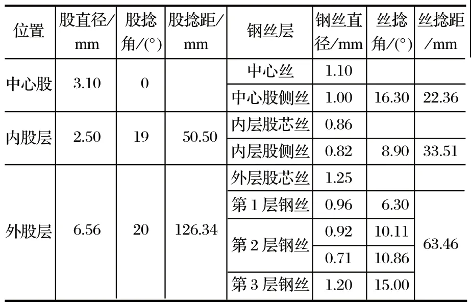 從表2 可以看出,鋼絲繩主要分為 3 層,中 心股、內股和外股;3 股的直徑不同,并且股捻距也存在一定的差異。在進行仿真求解時,需要對各個層進行定義。